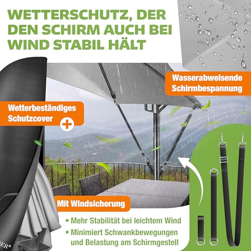 - 𝐈𝐍𝐊𝐋𝐔𝐒𝐈𝐕𝐄 𝐒𝐂𝐇𝐈𝐑𝐌𝐂𝐎𝐕𝐄𝐑: Das mitgelieferte Cover für Schutz gegen Regen und UV-Strahlung sorgt dafür, dass Ihr Sonnenschirm optimal geschützt ist. Insbesondere wenn Sie Ihren Schirm längere Zeit nicht nutzen, empfiehlt sich die Schirm Abdeckung überzuziehen, um ein Ausbleichen zu verhindern.