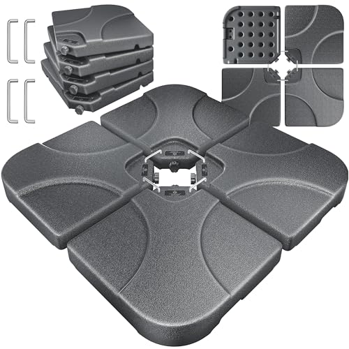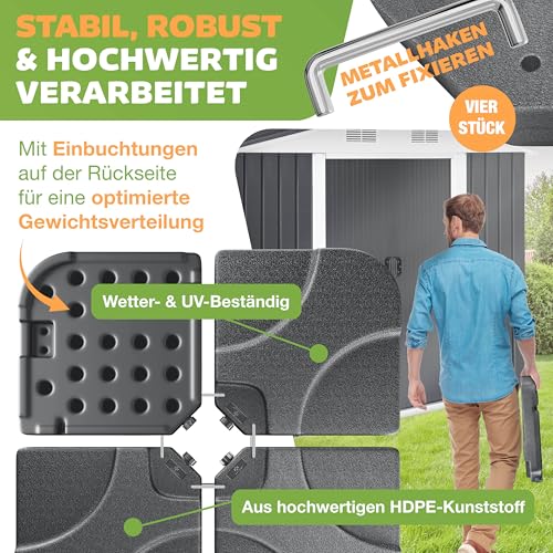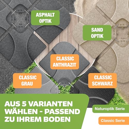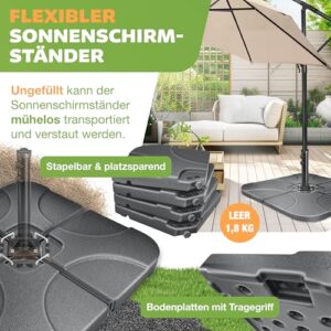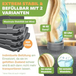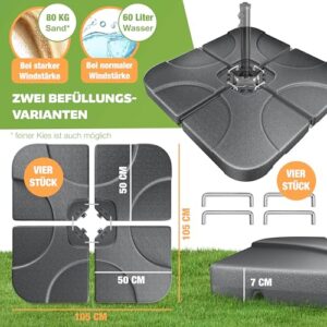 - 𝐄𝐈𝐍𝐅𝐀𝐂𝐇𝐄 𝐌𝐎𝐍𝐓𝐀𝐆𝐄: Ein Tragegriff ermöglicht Ihnen ein einfaches Bewegen der vier Bodenplatten, einfach an den Wunschort transportieren und je nach Wunsch und Wetterlage mit einem Wasserschlauch oder Gießkanne mit 60 Liter Wasser befüllen. Bei starkem Wind können Sie die Schirmgewichte mit 80 Kg Sand oder Kies füllen. Nun können Sie dank dem Stecksystem alle Bodenplatten mit den Metallhaken befestigen. Dadurch erhalten Sie einen festen Sitz und verrutschen ist ausgeschlossen.