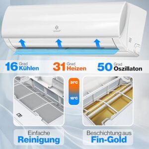 - 𝐋𝐀𝐍𝐆𝐋𝐄𝐁𝐈𝐆 & 𝐖𝐀𝐑𝐓𝐔𝐍𝐆𝐒𝐀𝐑𝐌: Die KESSER Klimaanlage ist mit einer Fin-Gold-Beschichtung ausgestattet, die das Gerät vor Korrosion schützt und die Reinigung erleichtert. Diese langlebige Technologie sorgt dafür, dass das Gerät auch bei intensiver Nutzung eine lange Lebensdauer hat, während die Wartung auf ein Minimum reduziert wird.