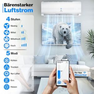 - 𝐋𝐄𝐈𝐒𝐓𝐔𝐍𝐆𝐒𝐒𝐓𝐀𝐑𝐊 & 𝐄𝐅𝐅𝐈𝐙𝐈𝐄𝐍𝐓: Die KESSER Klimaanlage ist mit einer Leistung von 9000 BTU (2600 W) oder 12000 BTU (3400 W) ausgestattet und bietet einen starken Luftdurchsatz von 420 m³/h bzw. 550 m³/h. Diese hohe Leistung sorgt für schnelle Kühlung und effizientes Heizen, ideal für verschiedene Raumgrößen und Anwendungen.