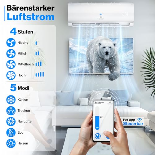 - 𝐊𝐎𝐌𝐅𝐎𝐑𝐓 𝐍𝐀𝐂𝐇 𝐈𝐇𝐑𝐄𝐍 𝐖Ü𝐍𝐒𝐂𝐇𝐄𝐍: Mit der smarten App-Steuerung und den verschiedenen Betriebsmodi können Sie die KESSER Klimaanlage exakt an Ihre Bedürfnisse anpassen. Ob angenehme Kühlung an heißen Tagen, effizientes Heizen in der Übergangszeit oder gezielte Luftentfeuchtung – genießen Sie jederzeit die volle Kontrolle über Ihr Raumklima und schaffen Sie sich Ihre persönliche Wohlfühlatmosphäre.
