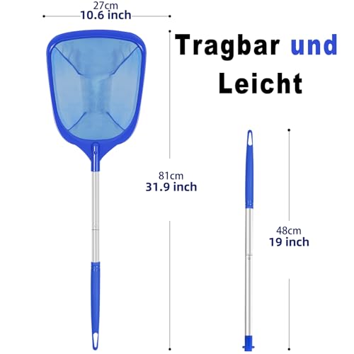 - Langlebiges & Leichtes Schwimmbad-Netz – Perfektes Gleichgewicht Das 31.9(81cm)-Zoll-Schwimmbad-Netz mit abnehmbarem 19(48cm)-Zoll-Griff wiegt nur 158g und hat eine erweiterte Reichweite. Es ist aus hochfester Aluminiumlegierung hergestellt, die sich nicht verbiegt und auch bei schweren Abfällen stabil bleibt. Das speziell entworfene 12 cm tiefe Netz sorgt für eine effektivere Sammlung und Aufbewahrung von Abfällen und eine zuverlässigere Reinigungserfahrung im Vergleich zu wackeligen Reinigungsnetzen