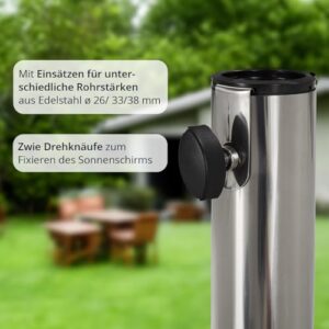 - Für alle gängigen Schirmgrößen | Dank der 3 Kunststoffeinsätze können Sie Stangen mit einem Durchmesser von 26 - 38 cm leicht und einfach befestigen.