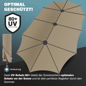 - SEHR STARKER UV SCHUTZ & SCHUTZHÜLLE - Mit der UV Schutzklasse von 80+ bist du und deine Gäste perfekt vor der Sonne und der Hitze geschützt. Die passende Schirmabdeckung wird dir direkt mitgeliefert, sodass der Schirm bei Nichtgebrauch optimal vor Schmutz und Nässe geschützt bleibt.