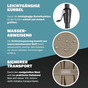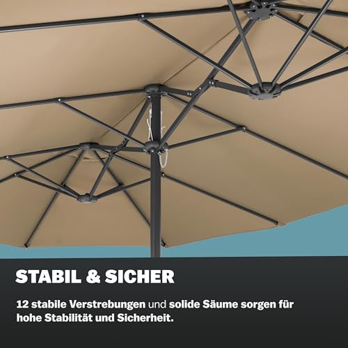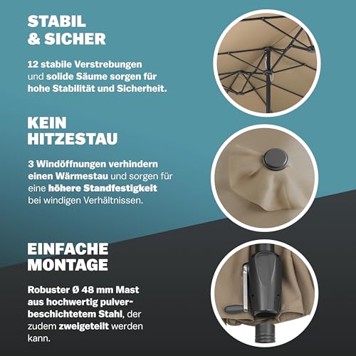 - LEICHTGÄNGIGE KURBEL - Du kannst den Terrassenschirm ganz einfach über das integrierte Kurbelsystem öffnen und schließen. Das mühsame Aufspannen des Doppelsonnenschirms gehört somit der Vergangenheit an. So wird der Marktschirm zu deinem perfekten Begleiter durch den Sommer.