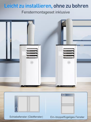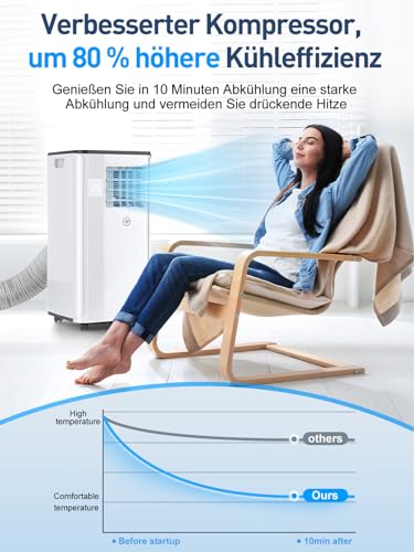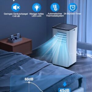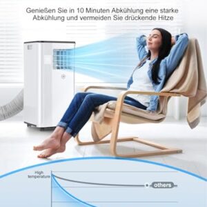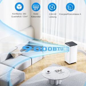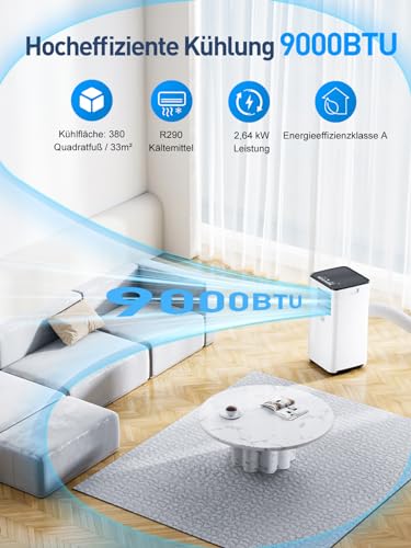 Klimaanlage Mobil 9000 BTU, 3-in-1 Mobile Klimaanlage mit Abluftschlauch,Kühlen,Entfeuchten, Luftzirkulation, LED Display&Fernbedienung, 24h-Timer, Leise&Energieeffizient, Für Räume bis zu 88 m³(33㎡