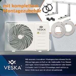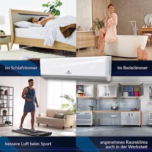 - ✔ 𝐊𝐎𝐌𝐏𝐋𝐄𝐓𝐓-𝐏𝐀𝐊𝐄𝐓: Split-Klimagerät im Komplett-Set inkl. Wifi: ECO Smart Innen- und Außeneinheit mit Gold-Fin-Beschichtung. Mit modernstem Kältemittel vorgefüllt – inklusive 5m Kupferrohren + Anschlusskabel sowie Wandhalterung und Montagezubehör. Das Set wird durch eine Fernbedienung mit beleuchtetem LCD-Display, Dichtmittel für den Mauerdurchbruch, Isolierband, Ablaufschlauch und ein Stromverbindungskabel zwischen der Inneneinheit und der Außeneinheit perfekt abgerundet.