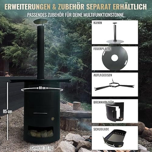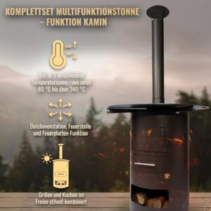 - Multifunktionale Komplettlösung – Set enthält Multifunktionstonne, 80cm Feuerplatte (5mm stark, 20cm Innenloch), Schornstein, Klappe, Feuerkorb und Abstandshalter. Alles für Grill- und Kaminfans.