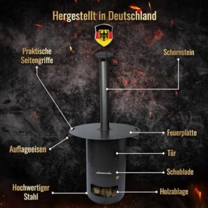 - Praktische Details – Die Klappe und der Feuerkorb ermöglichen einfaches Nachlegen von Holz, während Abstandshalter für optimale Hitze sorgen. Ideal für Grill- und Kaminanwendungen.