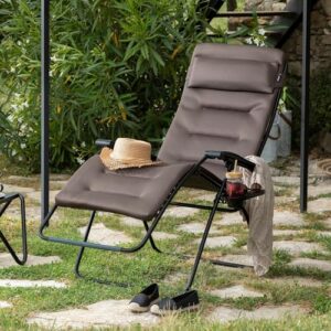 - ZERO-GRAVITY-POSITION: Mit der Zero-Gravity-Position, in der Ihre Beine leicht über dem Herzen liegen, in einem idealen 127° Winkel für die Blutzirkulation und perfekte Entspannung. Ein unverzichtbarer Komfort! Verstellbare Position mit Stabilisatoren. Ergonomische Armlehnen aus Harz und Schaumstoff. Verstellbare und abnehmbare Kopfstütze. Klappbarer Liegestuhl mit Schutzring für die Fußstütze und Fußkappen.