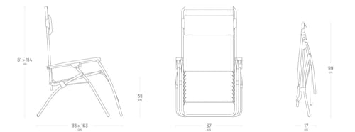 - GRÖSSE UND MERKMALE: Maße des geöffneten Relaxsessels: 81 bis 114 x 67 x 88 bis 163 cm. Maße geschlossen: 99 x 67 x 17 cm. Gewicht: 6,6 kg. Luftiges Gewebe, 1-Faden-Webmuster, mit UV-Schutzbeschichtung. Ideal, um viele Sonnenbäder zu genießen, ob im Urlaub oder zu Hause!