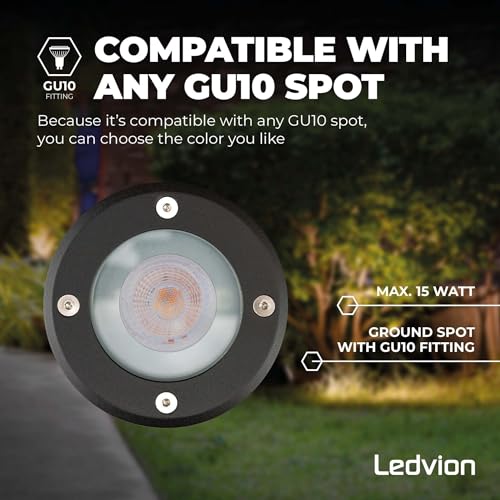 - LED Bodenstrahler mit GU10 Fassung. Dieser Bodenstrahler wird ohne GU10 Lampe geliefert, damit die Lichtfarbe selbst bestimmt werden kann. Das Glas ist versehen mit einem anti reflektions Ring.