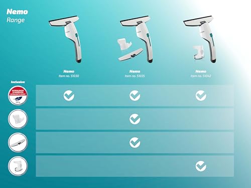 - Lieferumfang - Leifheit Elektrischer Fenster- und Badreiniger Nemo, Baddüse mit weißer Lippe, Halterung mit Klemmechanismus bis 20mm Tiefe, vorgebohrte Schraublöcher, Ladegerät, Artikelnummer: 51035