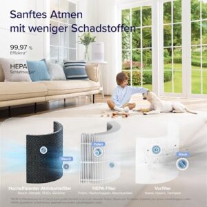 - 𝐕𝐞𝐫𝐛𝐞𝐬𝐬𝐞𝐫𝐭𝐞𝐬 𝟑 𝐢𝐧 𝟏 𝐅𝐢𝐥𝐭𝐞𝐫𝐬𝐲𝐬𝐭𝐞𝐦: HEPA-, Aktivkohlefilter und Vorfilter entfernen Schadstoffe mit Größe von 0,3 um aus der Luft, damit Sie vor Pollen, Staub, Tierhaaren, Schimmelpilzsporen, Industrie- und Autoabgase und Gerüche geschützt sind