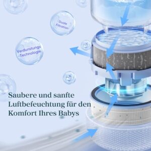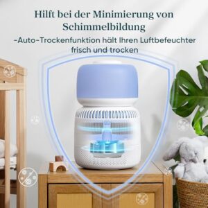 - 𝗔𝘂𝘁𝗼𝗺𝗮𝘁𝗶𝘀𝗰𝗵𝗲𝘀 𝗧𝗿𝗼𝗰𝗸𝗻𝗲𝗻: Nach dem Gebrauch hilft die automatische Trocknungsfunktion des Luftbefeuchters, den Filter trocken zu halten und das Wachstum von Schimmel und Geruch zu verhindern, wodurch eine gesunde Umgebung für Ihr Baby geschaffen wird