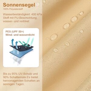 - 【Wasserdichtes Sonnensegel】Die wasserabweisende PU-Beschichtung macht das Gewebe langlebig und wasserabweisend. Größere Modelle mit heißversiegelten Nähten für maximale Dichtigkeit. 400 kPa Wassersäule – zuverlässiger Schutz bei leichtem Regen. Optimaler Wasserablauf durch 20–40° Neigung. Regelmäßiges Nachspannen erhöht Stabilität und Lebensdauer.