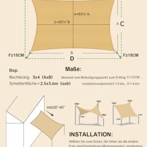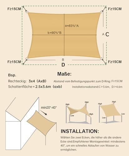 - 【Maßangaben】:Die angegebenen Abmessungen entsprechen der Distanz von D-Ring zu D-Ring. Bitte planen Sie einen Abstand von 15-30 cm zwischen dem Befestigungspunkt und dem Sonnensegel ein, um die Halterungen/Haken oder Seile zu montieren. (Bitte beachten Sie die von uns bereitgestellten Maßbilder). Wählen Sie Größe und Farbe entsprechend Ihren Wünschen. Durch manuelle Näharbeiten ergibt sich eine Toleranz von +/- 5 cm.