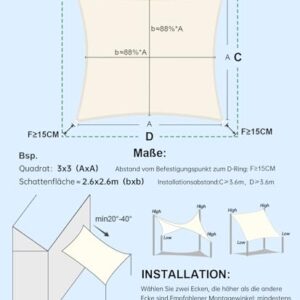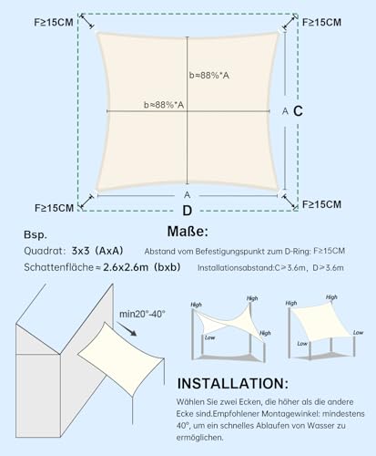 - 【Maßangaben】:Die angegebenen Abmessungen entsprechen der Distanz von D-Ring zu D-Ring. Bitte planen Sie einen Abstand von 15-30 cm zwischen dem Befestigungspunkt und dem Sonnensegel ein, um die Halterungen/Haken oder Seile zu montieren. (Bitte beachten Sie die von uns bereitgestellten Maßbilder). Wählen Sie Größe und Farbe entsprechend Ihren Wünschen. Durch manuelle Näharbeiten ergibt sich eine Toleranz von +/- 5 cm.