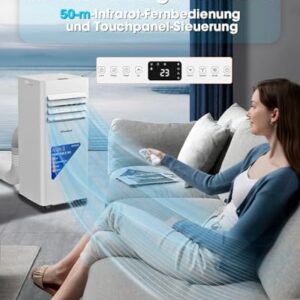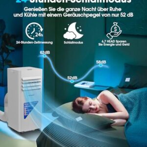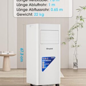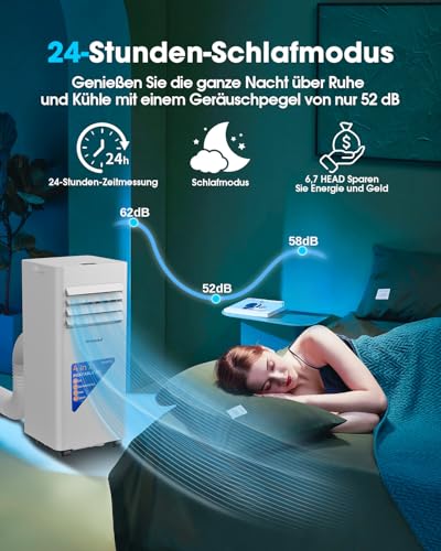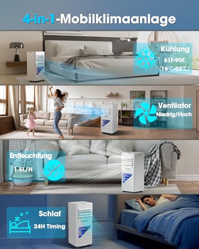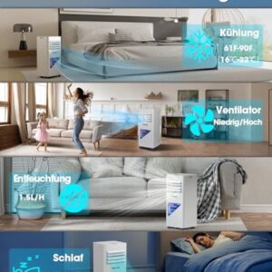 - 4-in-1 Funktionen: Klimaanlage, Entfeuchter (1,5 l/h) ,Schlafen und Lüfter. Im Entfeuchtungsmodus entfernt das Gerät bis zu 1,5 Liter Feuchtigkeit pro Stunde, ideal für feuchte Sommertage. Die starke Lüftungsfunktion arbeitet ohne Kühlung.