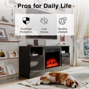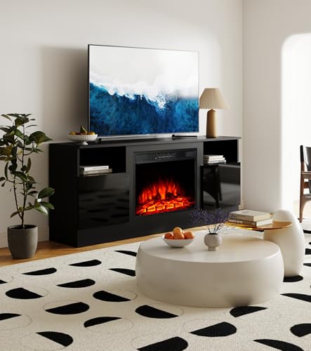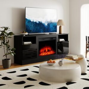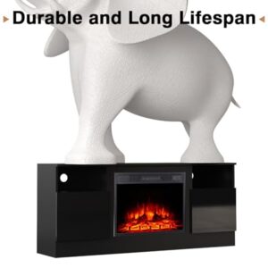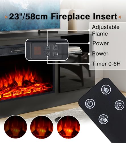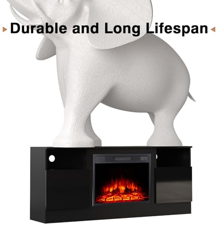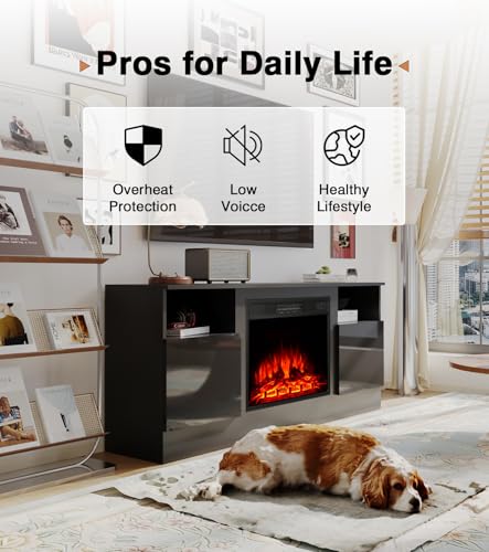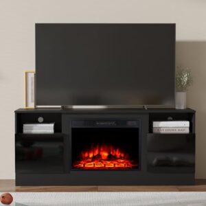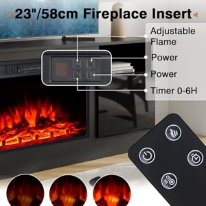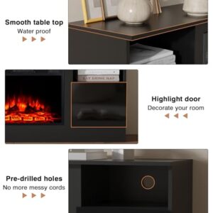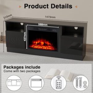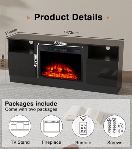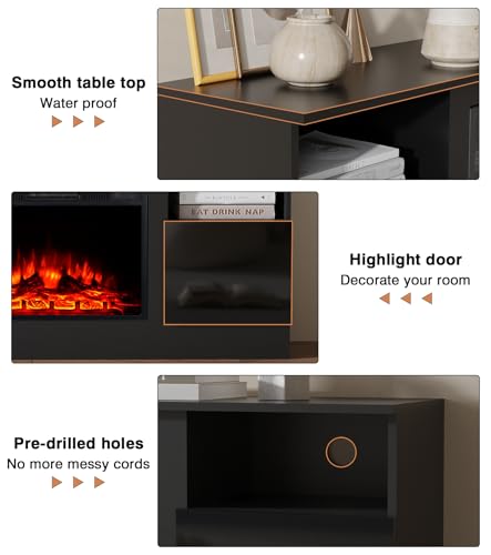 M.C.Haus Elektrischer Kamin mit TV-Ständer, 58.8cm Kamin, für bis zu 143.9 * 80cm TV, Modernes Holzstruktur Entertainment Center mit LED Licht, Highlight Schrank und Glasfront, 147.3cm, Schwarz