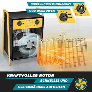 - 𝐋𝐄𝐈𝐒𝐓𝐔𝐍𝐆𝐒𝐒𝐓𝐀𝐑𝐊 𝐔𝐍𝐃 𝐑𝐄𝐆𝐔𝐋𝐈𝐄𝐑𝐁𝐀𝐑: Wählen Sie schnell und unkompliziert eine aus drei Heizstufen durch simples drehen am Regler aus. Zusätzlich können Sie dank des stufenlosen Thermostats eine schnelle und simple Temperaturanpassung vornehmen. Damit neben der Wärmeregulierung die Hitze gleichmäßig verteilt werden kann, sorgt ein integrierter Rotor für die optimale Wärmeverteilung.