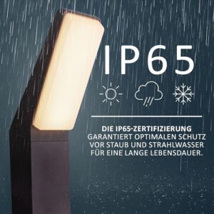- IP65 EXTREM WETTERFEST: Im Vergleich zu herkömmlichen IP44-Leuchten bietet die EVA-Serie zertifizierten Schutz gegen Strahlwasser und Staub. Das pulverbeschichtete Aluminium in Anthrazit garantiert Langlebigkeit und Rostfreiheit zu jeder Jahreszeit.