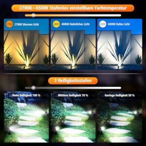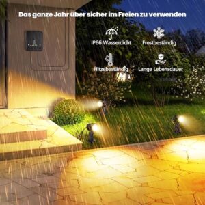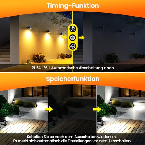 - 【Speicherfunktion und 2H/4H/6H Geplante Abschaltfunktion】Ob Fernabschaltung, Stromausfall oder Abschaltung, die Garten Spots LED kann sich die letzte Lichteinstellung merken, ohne sie erneut einzustellen (Hinweis: Die Timing-Funktion kann nicht gespeichert werden und muss zurückgesetzt werden ). Es ist nicht nötig, den Strom vor dem Schlafengehen oder nach einer Party auszuschalten, was praktisch ist und Energie spart