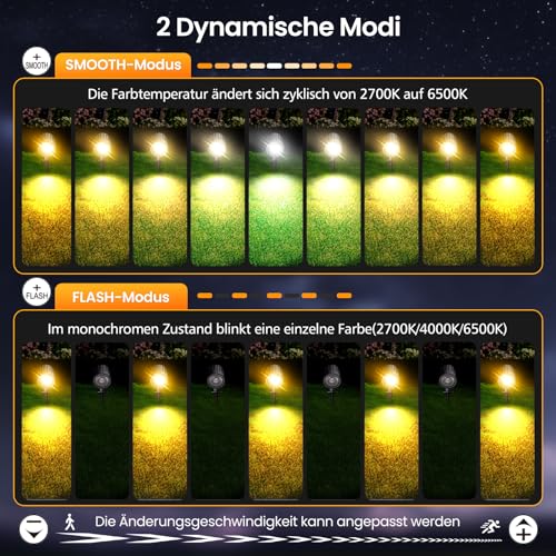 - 【2 Dynamische Modi】MEIKEEs ursprünglicher SMOOTH-Modus (Helligkeit ändert sich in einem Zyklus von stark zu dunkel, dann von dunkel zu stark) und FLASH-Modus (Blitzmodus, leuchtet auf, erlischt, leuchtet wieder auf und so weiter), verleiht Ihrem Zuhause einen Hauch dynamischer Schönheit, perfekt für Festivals und Partys. MEIKEE-Gartenleuchte bieten Ihnen ein neues Lichterlebnis!