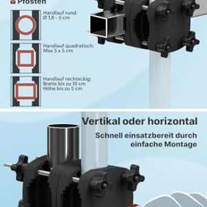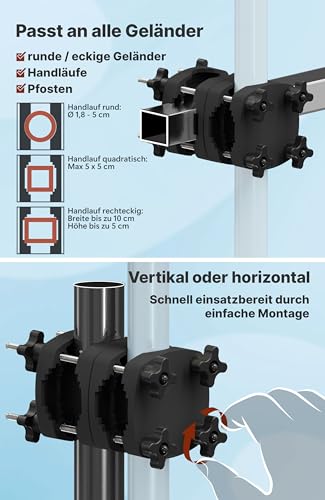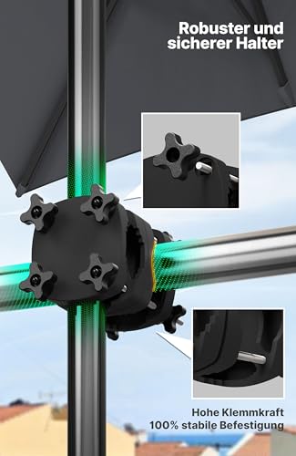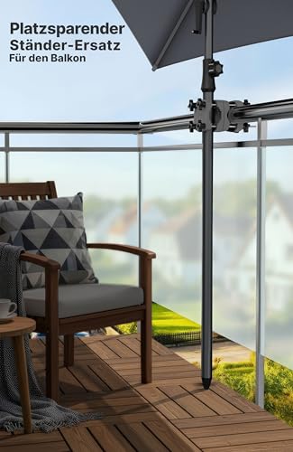 - STABILE UNIVERSALHALTERUNG: Passt an jedes Geländer, ein schwerer Ständer ist unnötig. Das spart enorm Platz. Ideal als Schirm für kleine Balkone, auch für kleine Sonnenschirme geeignet