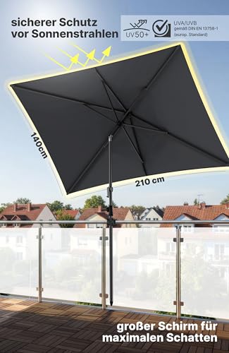 - GANZTÄGIGER UV-SCHUTZ: Der UV50+ Sonnenschirm rechteckig (210x140cm) ist 45° knickbar und höhenverstellbar. So bietet er den ganzen Tag über perfekten Sonnenschutz Balkon.