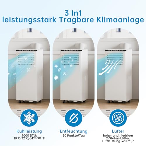 - 9000 BTU Leistung & R290 Kühlmittel sorgen für effiziente, energiesparende Kühlung auch an heißen Tagen.