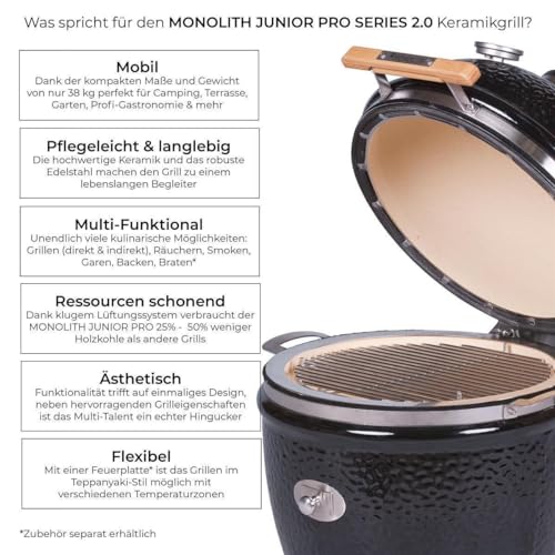 - Ressourcen schonend: Dank klugem Lüftungssystem verbraucht der MONOLITH JUNIOR sehr wenig Holzkohle im Vergleich zu klassischen Holzkohlegrills. Die Kombination aus Edelstahl und hochwertiger Keramik macht den Grill zum lebenslangen Begleiter während günstige Grills oft nach kurzer Zeit bereits ersetzt werden müssen.