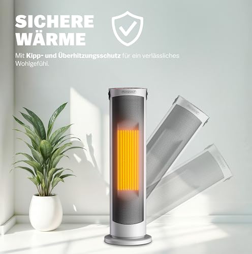 - SICHER: Zur Sicherheit dient nicht nur das robuste Metallgitter vor dem Keramikheizelement, sondern zusätzlich ein Kippschutz mit integrierter Sicherheitsabschaltung sowie ein Überhitzungsschutz. Die Kindersicherung verhindert zudem ein ungewolltes Einschalten des Heizers.