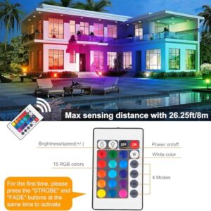 - 【Fernbedienung und Speicherfunktion】Unser RGB-Scheinwerfer wird mit der Fernbedienung geliefert und kann die Entfernung von 6 bis 8 m erkennen, sodass Sie dieses mehrfarbige Licht einfach steuern können. Außerdem kann der Außenscheinwerfer die letzte Farbe und ihren letzten Modus speichern, ohne dass der Farbmodus der Lampe beim Einschalten zurückgesetzt werden muss.