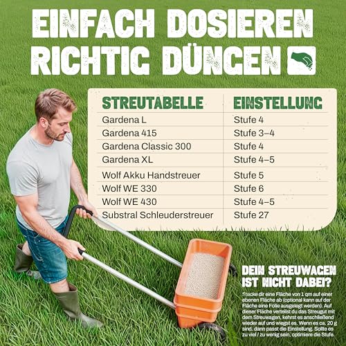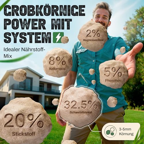 - MÜHELOSE ANWENDUNG – Verteilen Sie unseren groben Stickstoffdünger bei min. 10°C gleichmäßig (20-30g/m²) auf feuchtem, gemähtem Rasen, wässern Sie leicht nach, um die Nährstoffe einzuarbeiten und genießen Sie eine dichte und kräftige Wiese ohne großen Aufwand.