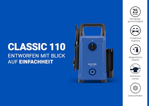 - HOCHDRUCKREINIGER: Praktisch und benutzerfreundlich – anschließen, sprühen und reinigen. Der Nilfisk Classic sorgt für eine gründliche Außenreinigung rund ums Haus – schnell, mühelos und effektiv.
