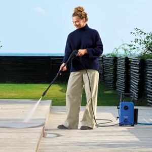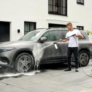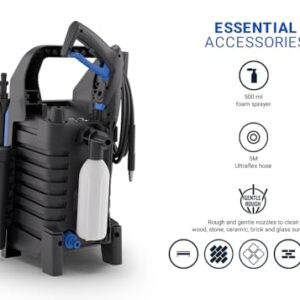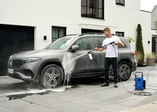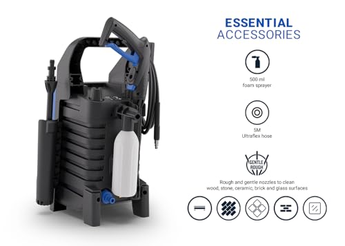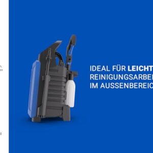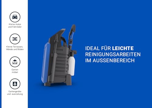 - WICHTIGES ZUBEHÖR: Der Hochdruckreiniger ist ausgestattet mit einer Groben Düse für hartnäckigen Schmutz, einer Sanften Düse für empfindliche Oberflächen sowie einem 500-ml-Schaumsprüher für die Autowäsche oder die Vorreinigung.
