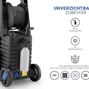 - WICHTIGES ZUBEHÖR: Der Hochdruckreiniger ist ausgestattet mit einer Groben Düse für hartnäckigen Schmutz, einer Sanften Düse für empfindliche Oberflächen sowie einem 500-ml-Schaumsprüher für die Autowäsche oder die Vorreinigung.