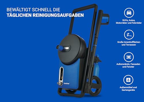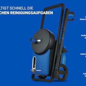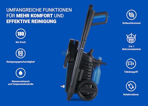 - MERKMALE: 180 bar Druck, 60m²/h Reinigungsgeschwindigkeit, 498 l/h Wasserdurchfluss, 12m Steelflex-Schlauch, leistungsstarker Induktionsmotor und Metallpumpe, Teleskopgriff und rotierende Lanze.