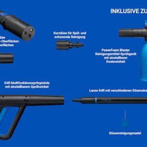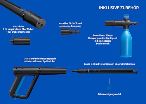 - ZUBEHÖR: Enthält ein Power-Schaumstrahler, eine Kurzstrahldüse, 3-in-1-Mehrzweckpistole mit verschiedenen Düseneinstellungen und eine Düsenreinigungsnadel.