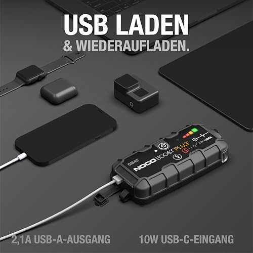 - LIEFERUMFANG – Enthält eine GB40 Starthilfe Powerbank, robuste Booster-Klemmen, USB-C-Ladekabel und Mikrofasertasche. Entwickelt in den USA, 1 Jahr Garantie inklusive.