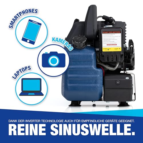 - ✔ INVERTER: Die eingebaute Inverter Technologie des Stromerzeugers liefert optimale Stromqualität und schützt vor Spannungsspitzen. Damit ist der Generator geeignet zum Betrieb von empfindlichen Geräten wie Handy, Laptop und vielen weiteren Geräten.