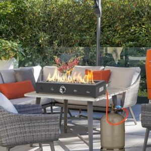 - TISCHFEUERSTELLE OUTDOOR:Entworfen als Gas-Propan-Feuerstelle, sieht eine rechteckige Gasfeuerschale mit einem einfachen Liniendesign schön und geschmackvoll aus und gibt Ihnen ein gemütliches Gefühl. Saubere Propangasflamme, schaltet einfach Ihre Gasfeuerstelle ein, um Flammen zu erzeugen, die hell gegen die Lavasteine strahlen, um eine angenehme Atmosphäre zu schaffen.