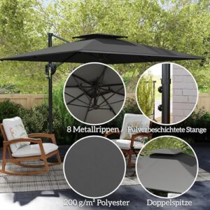 - Hochwertiges Material: Aus strapazierfähigem 200 g/m²-Polyester gefertigt, schützt der Ampelschirm zuverlässig vor UV-Strahlen (UPF30+), Sonneneinstrahlung und leichtem Wind. 8 robuste Metallstreben bieten zusätzliche Stabilität.