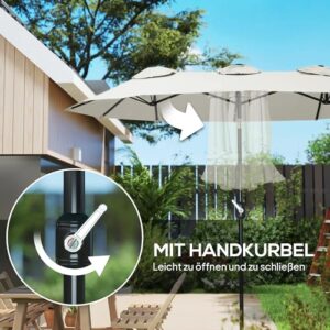 - Großer Doppelschirm: Dieser große Terrassenschirm für den Außenbereich spendet reichlich Schatten und kann bequem an einem Terrassentisch oder mithilfe eines Sockels fixiert werden. Genießen Sie die frische Luft im Garten bei Brettspielen oder einem erfrischenden Getränk, sicher geschützt vor brennender Sonne.