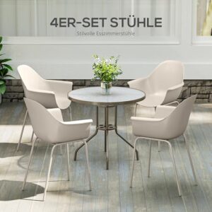 - Robuste Konstruktion: Diese Gartenstühle für den Essbereich sind darauf ausgelegt, lange zu halten, mit einem soliden Metallrahmen, der eine strapazierfähige pulverbeschichtete Oberfläche aufweist. Mit vier Beinen, die für optimale Balance konzipiert sind, bieten diese Stühle Stabilität und Zuverlässigkeit für eine langfristige Nutzung.