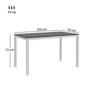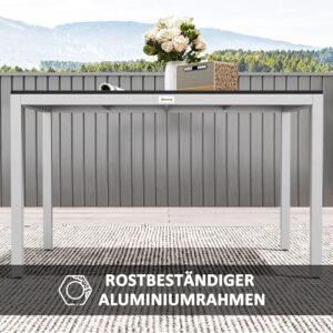 - Robust und Wetterfest: Mit einem Aluminiumrahmen und pulverbeschichteten Stahlkanten ausgestattet, ist der Terrassentisch rost- und wasserresistent und widersteht verschiedenen Wetterbedingungen.