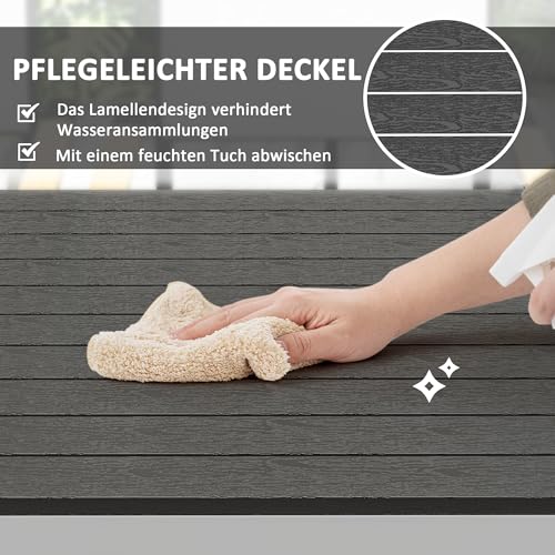 - Modernes schlankes Design: Der elegante Gartentisch zeichnet sich durch sein minimalistisches Design aus, mit einer lamellierten, holzähnlichen Oberfläche, die jedem Garten oder Patio stilvolle Eleganz verleiht.