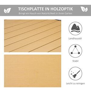 - TISCHPLATTE IN HOLZOPTIK: Die Kunststofflamellen auf der Tischplatte imitieren Holz, sind aber robuster und haltbarer. Außerdem trocknet sie nach Regen schnell und lässt sich leicht mit einem feuchten Tuch reinigen.