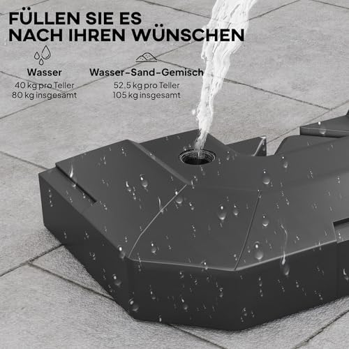 - Befüllbares Design: Sonnenschirm Gewichte wiegt bis zu 40 kg mit Wasser oder 52,5 kg mit Sand-Wasser-Mischung. Einfach befüllen für Stabilität und sicheren Schirmhalt.